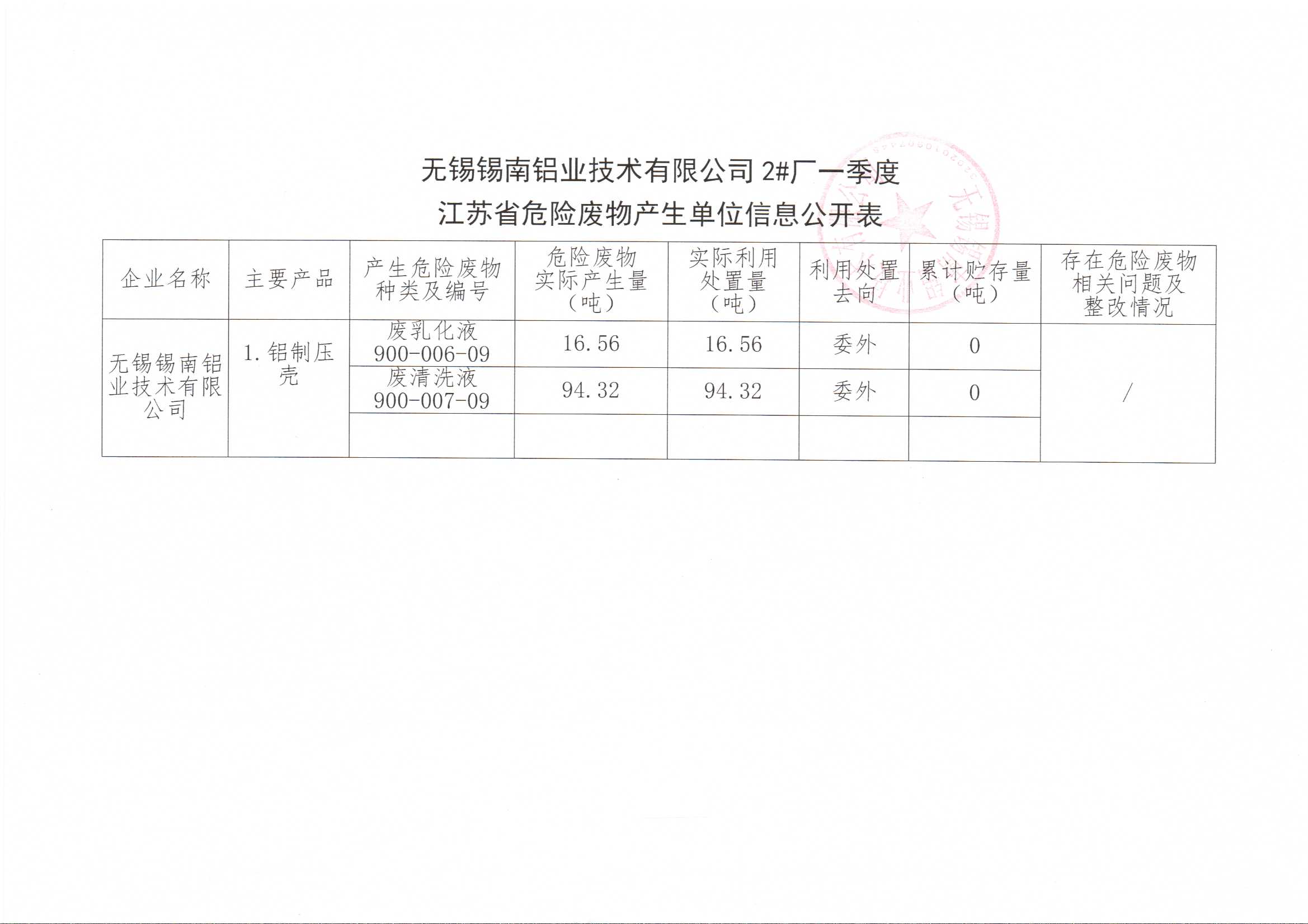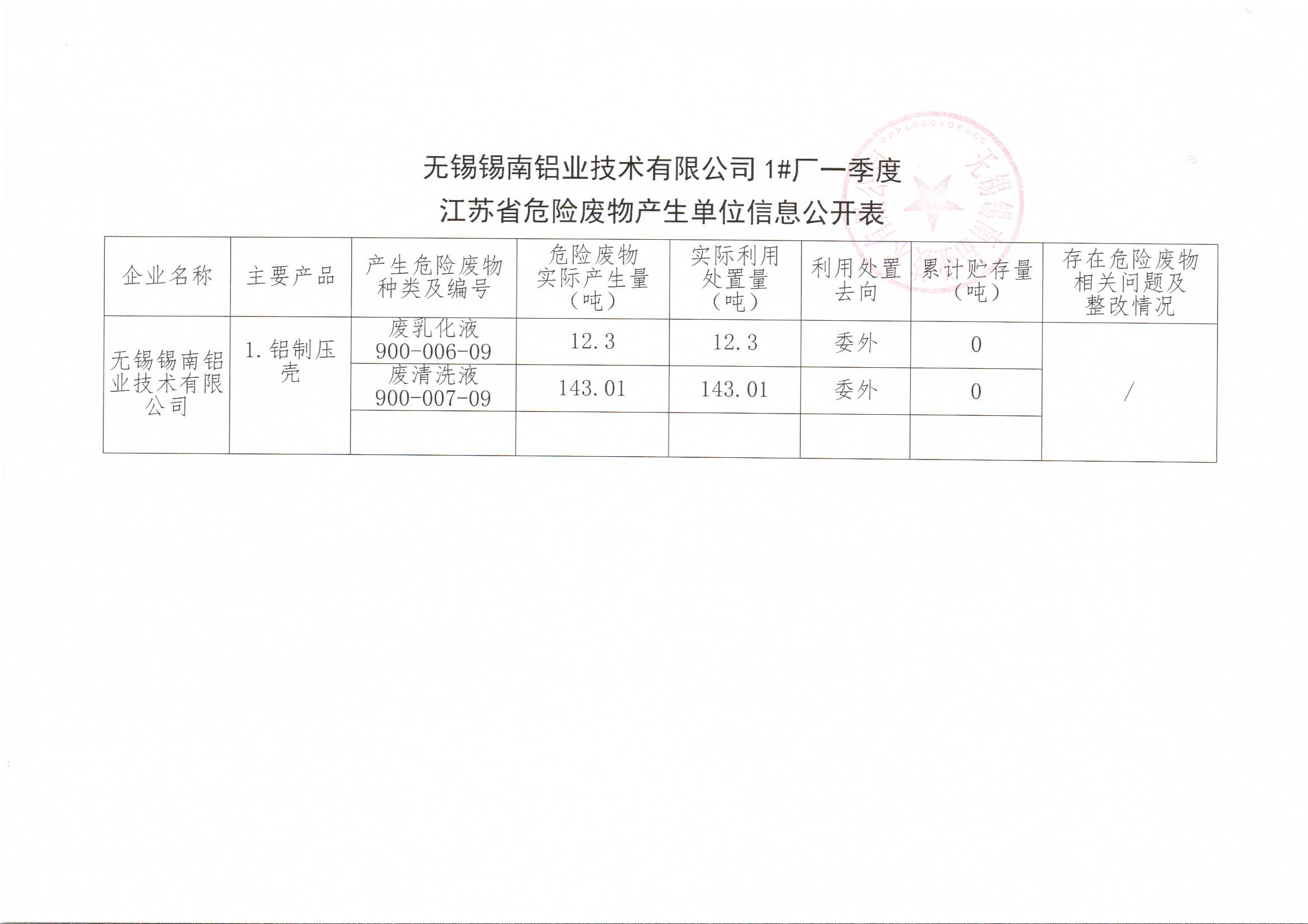 江蘇省危險廢物產(chǎn)生單位信息公開表(一季度)